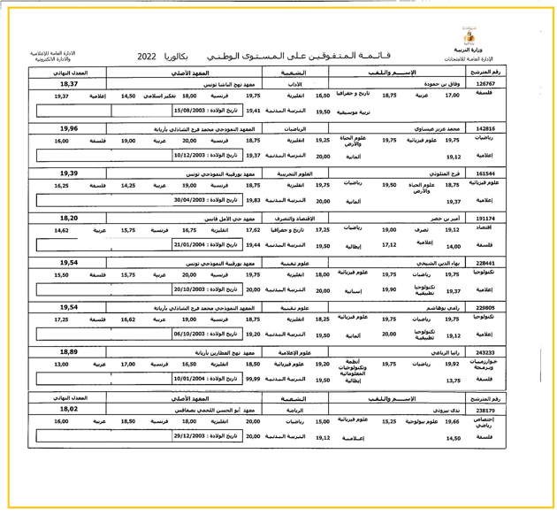 أصدرت وزارة التربية نتائج الدورة الرئيسية لإمتحان باكالوريا 2022 و قد نشرت قائمة المتفوقين على المستوى الوطني.