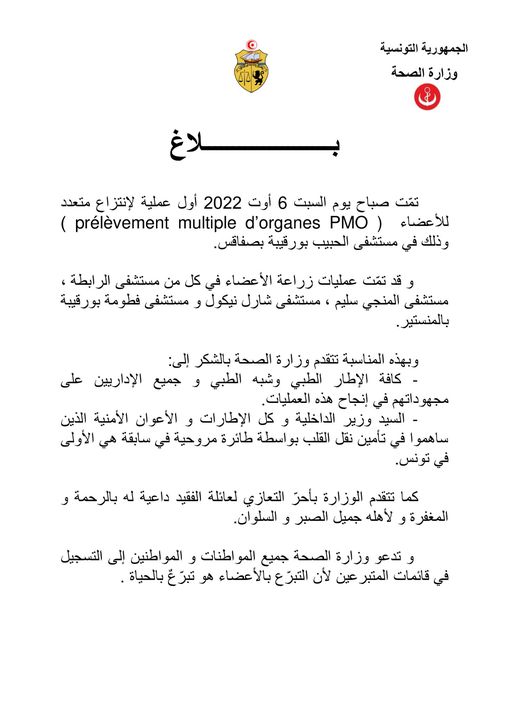 أعلنت وزارة الصحة عن إجراء أول عملية لانتزاع متعدد للأعضاء (prélèvement multiple d'organes PMO)، وذلك اليوم الإثنين 08 أوت 2022 بمستشفى الحبيب بورقيبة بصفاقس.