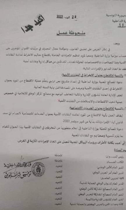 قرر وزير الداخلية توفيق شرف الدين إيقاف الاقتطاع من أجور الأمنيين بخصوص الانخراطات في النقابات الأمنية وذلك بداية من شهر 1 سبتمبر 2022.
