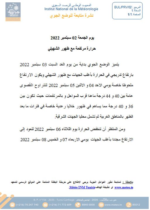 أفاد المعهد الوطني للرصد الجوي، في بلاغ اليوم الجمعة 2 سبتمبر 2022، بان درجات الحرارة ستسجل ارتفاعا تدلريجيا باغلب جهات الجمهورية مع ظهور رياح الشهيلي.