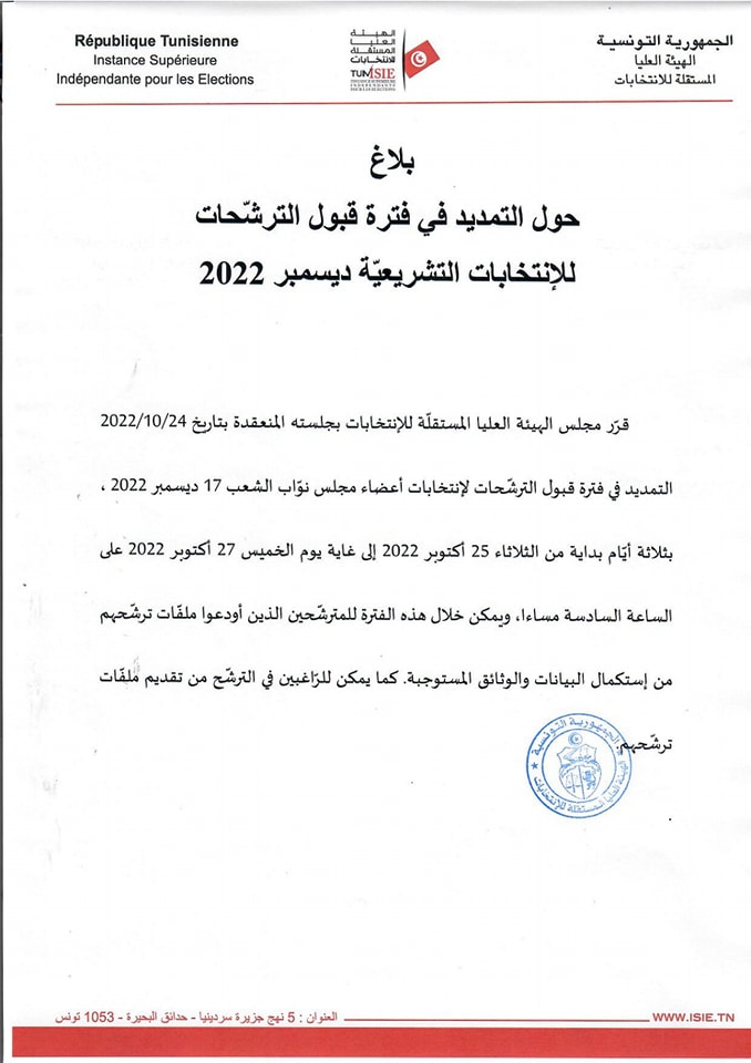قرر مجلس الهيئة العليا المستقلة للانتخابات بجلسته المنعقدة بتاريخ اليوم الإثنين 24 أكتتوبر 2022، التمديد في فترة قبول الترشحات لإنتخابات أعضاء مجلس نواب الشعب 17 ديسمبر 2022 بثلاثة أيام بداية من الثلاثاء 25 أكتوبر 2022 إلى غاية يوم الخميس 27 أكتوبر 2022 على الساعة السادسة مساء.