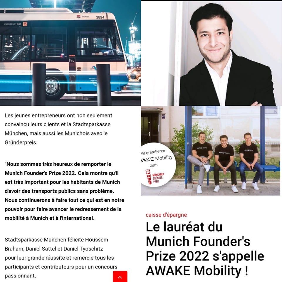 تحصل الشباب التونسي و المهندس حسام براهم على جائزة الاستثمار لمؤسس ميونخ الألمانية ''Prix du Fondateur de Munich '' لسنة 2022 من خلال مؤسسته الناشئة '' AWAKE Mobility ''.