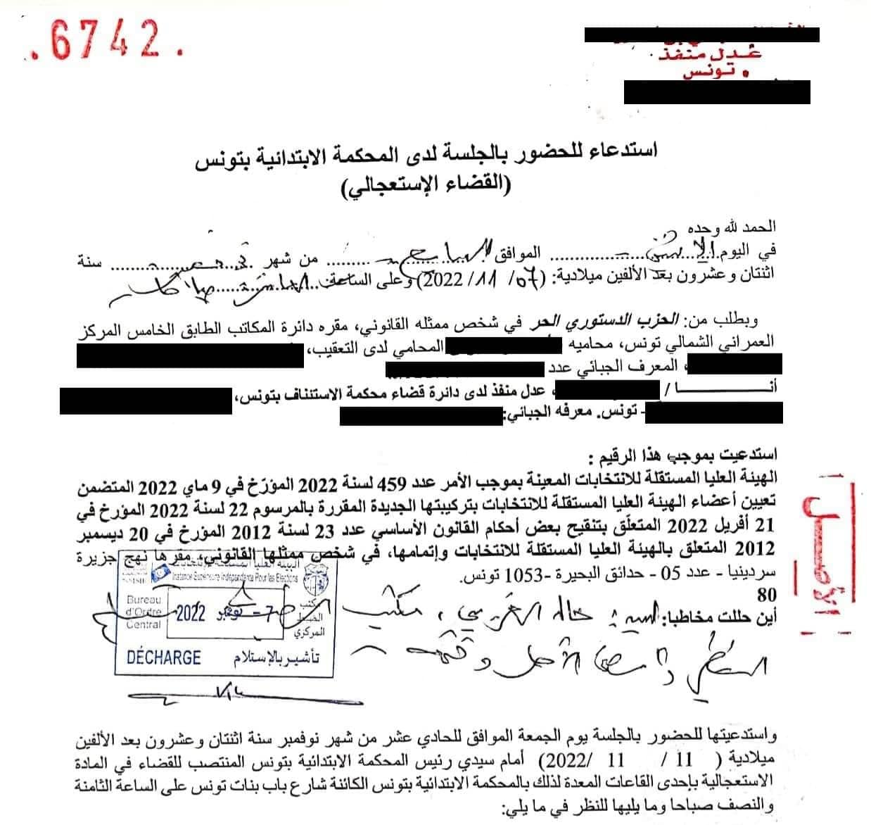 أعلن الحزب الدستوري الحر، اليوم الاثنين 7 نوفمبر 2022، أنه تقدم "بقضية استعجالية أمام المحكمة الابتدائية بتونس ضد هيئة الانتخابات لإيقاف مسار الانتخابات التشريعية المزمع اجراؤها في 17 ديسمبر 2022 وتجميد كافة المبالغ المالية المرصودة لها".