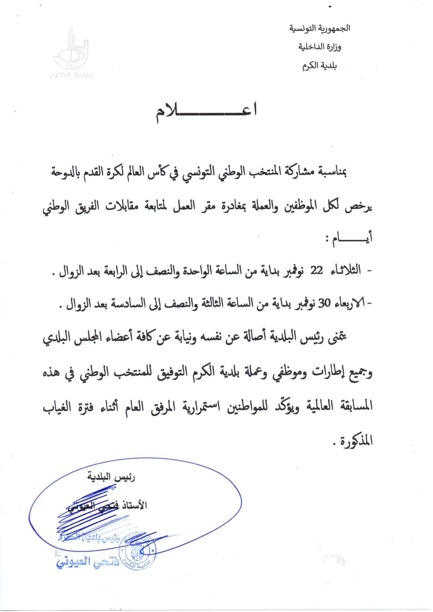 منحت بلدية الكرم كلّ موظفيها ترخيصا لمغادرة مقر العمل لمتابعة مقابلات المنتخب الوطني التونسي لكرة القدم خلال مشاركته في كأس العالم المُقام حاليا في قطر.
