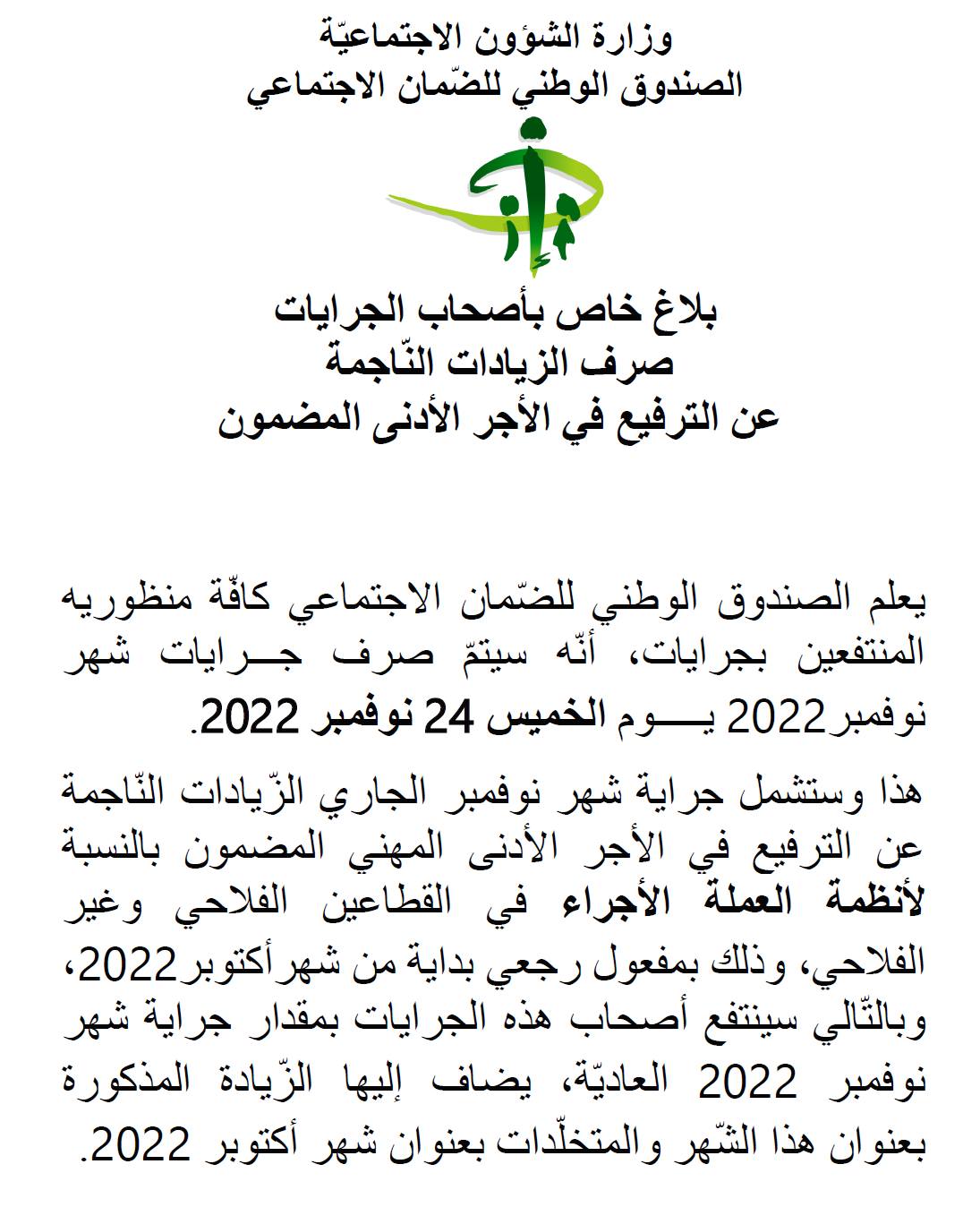 يعلم الصندوق الوطني للضّمان الاجتماعي كافّة منظوريه المنتفعين بجرايات، أنّه سيتمّ صرف جـــرايات شهر نوفمبر2022 يـــــوم الخميس 24 نوفمبر 2022.