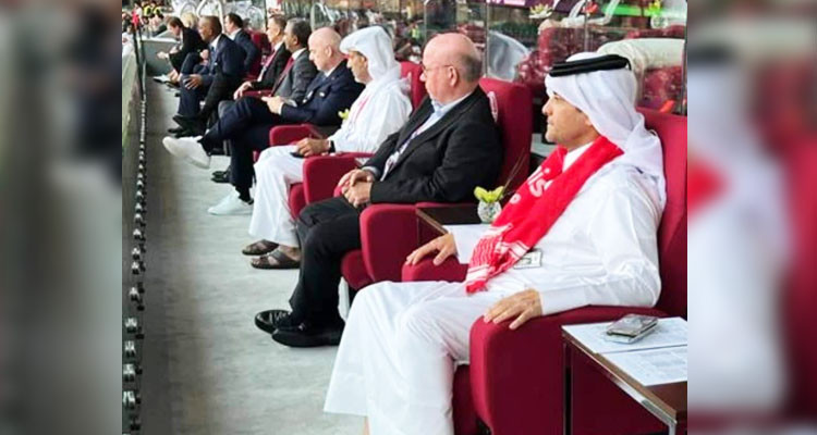 رصدت عدسات الكاميرا في ملعب المدينة التعليمية أمس الثلاثاء 22 نوفمبر 2022، خلال مقابلة المنتخب التونسي مع الدنمارك مدير الديوان الأميري القطري سعود بن عبد الرحمان ال ثاني متوشحا بعلم تونس كتعبير عن دعم قطر وتشجيعها للمنتخب التونسي.