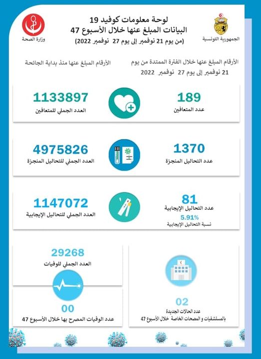 أفادت وزارة الصحة اليوم الثلاثاء 29-11-2022، أنه تم خلال الفترة المتراوحة بين 21 و 27 نوفمبر الجاري تسجيل 81 إصابة جديدة بفيروس "كورونا" دون تسجيل وفايات.