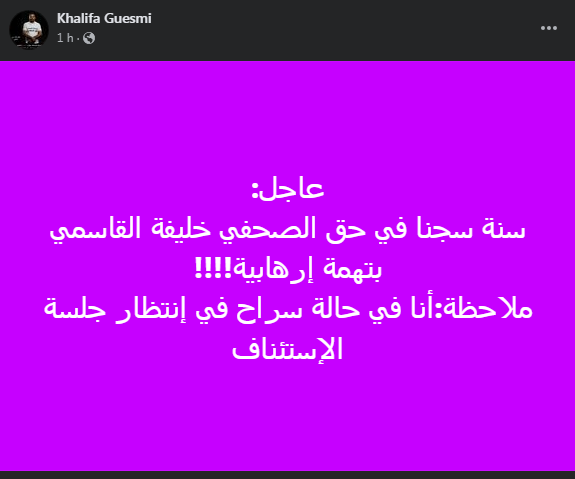 أعلن المراسل الصحفي خليفة القاسمي، أن الدائرة الجنائية المختصّة بالنظر في قضايا الإرهاب بالمحكمة الابتدائية بتونس، قضت في حقه بالسجن مدّة سنة، وهو حاليا في حالة سراح في انتظار جلسة الاستئناف.