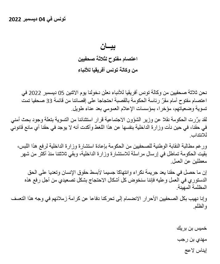 أعلن ثلاثة صحفيين،من وكالة تونس أفريقيا للأنباء ،دخولهم بداية من اليوم الاثنين 05 ديسمبر 2022 ، في إعتصام مفتوح أمام مقر رئاسة الحكومة بالقصبة إحتجاجا على إقصائهم من قائمة 33 صحفيا الذين تمت تسوية وضعياتهم، مؤخرا، بمؤسسات الإعلام العمومي بعد عناء طويل.