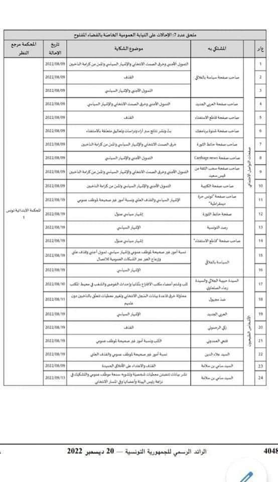وتضمن الملحق عدد 7 لتقرير هيئة الانتخابات حول استفتاء 25 جويلية 2022، الملفات الخاصة بالفضاء المفتوح التي احالتها هيئة الانتخابات على النيابة العمومية وعددها 27 ضد صفحات على مواقع "التواصل الاجتماعي" و"اشخاص طبيعيين"، وموضوع الشكاية وتاريخ الاحالة والمحكمة مرجع النظر.
