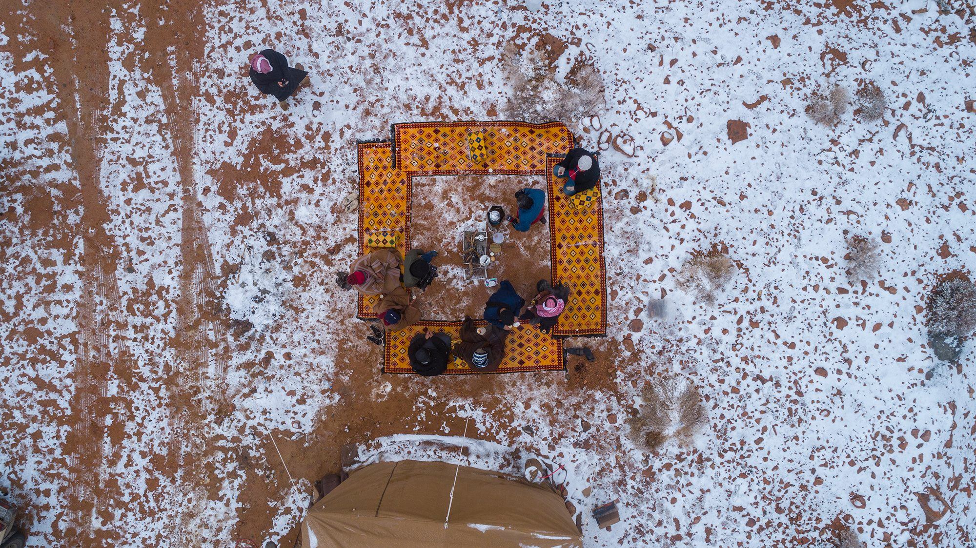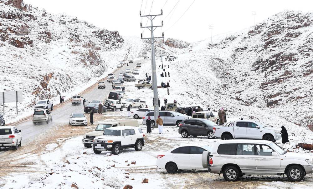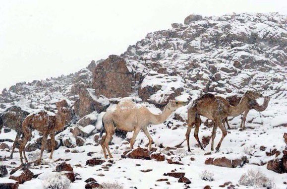 أظهرت صور نشرها رواد مقاطع التواصل الاجتماعي اليوم تساقط الثلوج على جبل اللوز في تبوك شمال السعودية.