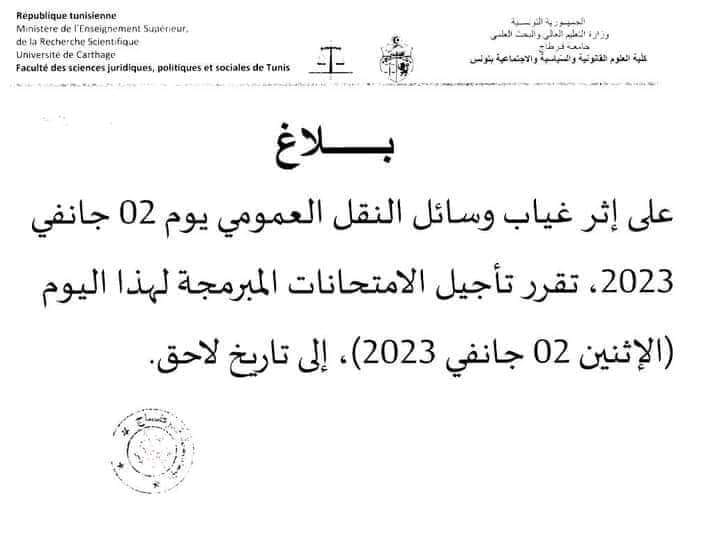 أعلنت كلية العلوم القانونية والسياسية والاجتماعية بتونس، تأجيل الامتحانات المبرمجة ليوم الاثنين 2 جانفي 2023 الى موعد لاحق بسبب غياب وسائل النقل العمومي.