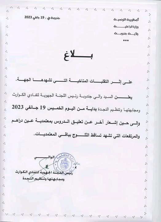 Le gouverneur de Jendouba et président de la commission régionale de lutte contre les catastrophes et d’organisation des secours annonce la suspension des cours, à compter de ce jeudi 19 janvier, dans la délégation de Aïn Draham et les hauteurs du reste des délégations, qui connaissent une chute de neige.