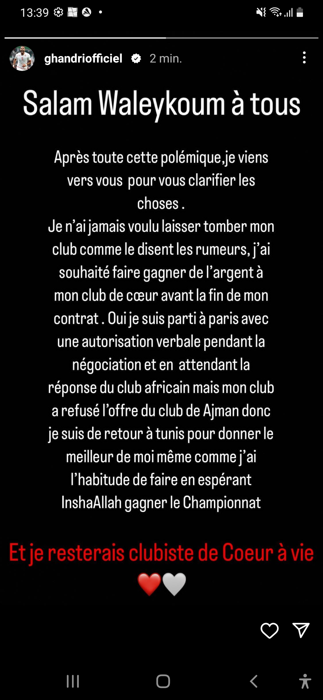Nader Ghandri a annoncé la nouvelle sur son compte Instagram en soulignant : ''Je suis parti à Paris après un accord verbal avec mes dirigeants. Je devais partir, mais tout en faisant faisant profiter le CA du montant du transfert. Mais, mes dirigeants ont exprimé leur souhait de me garder. Je reviens donc pour continuer mon aventure et terminer la saison tout en espérant aller le plus loin possible et jouer pour gagner le championnat ''.