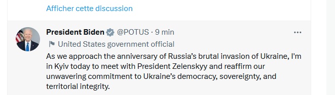 Dans un tweet, Biden a dit être venu Kiev pour rencontrer le président Zelensky et réaffirmer son '' soutien indéfectible envers la démocratie, la souveraineté et l’intégrité territoriale de l’Ukraine ''.