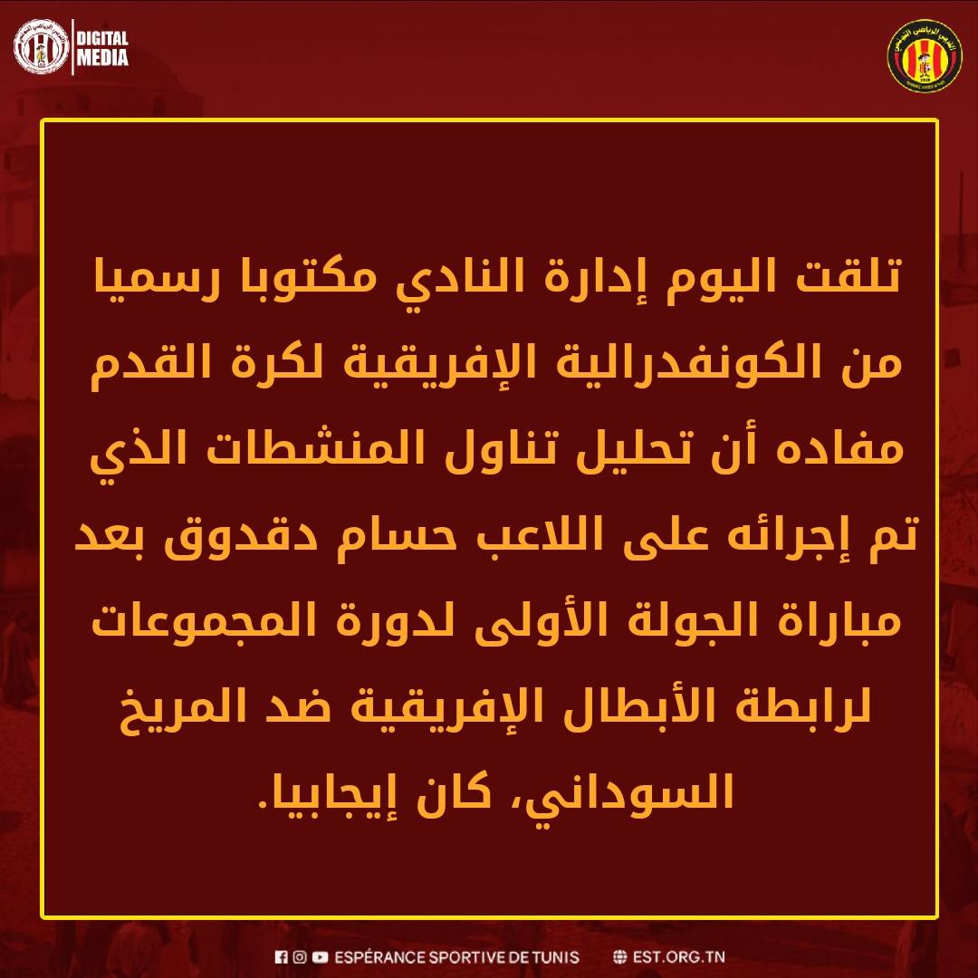 Dans un communiqué publié dans la soirée du jeudi 9 mars, l’Espérance Sportive de Tunis a fait savoir que la CAF a averti que le test anti-dopage effectué par Houssem Dagdoug, lors du match contre Al Merreikh, s’est avéré positif.