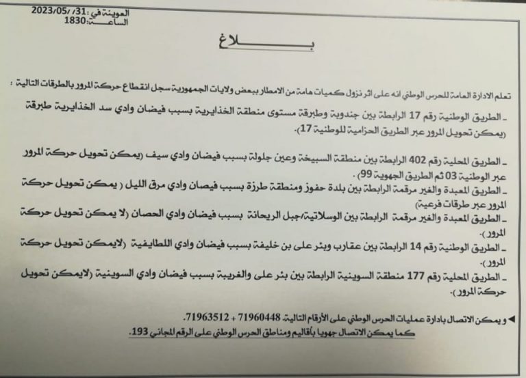 - La route locale n’o 117 de la région de Souinia reliant Bir Ali et el-Ghriba, à cause du débordement d’Oued Souinia (La circulation routière ne pourrait être déviée) ;