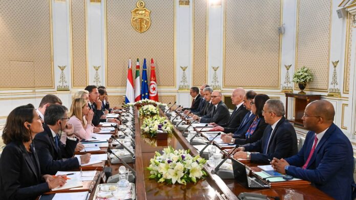 Le président de la République, Kais Saïed, a reçu,hier dimanche 11 juin 2023, la Première ministre italienne, Giorgia Meloni, la présidente de la Commission européenne, Ursula von der Leyen, ainsi que le Chef du gouvernement des Pays-Bas, Mark Rutte.