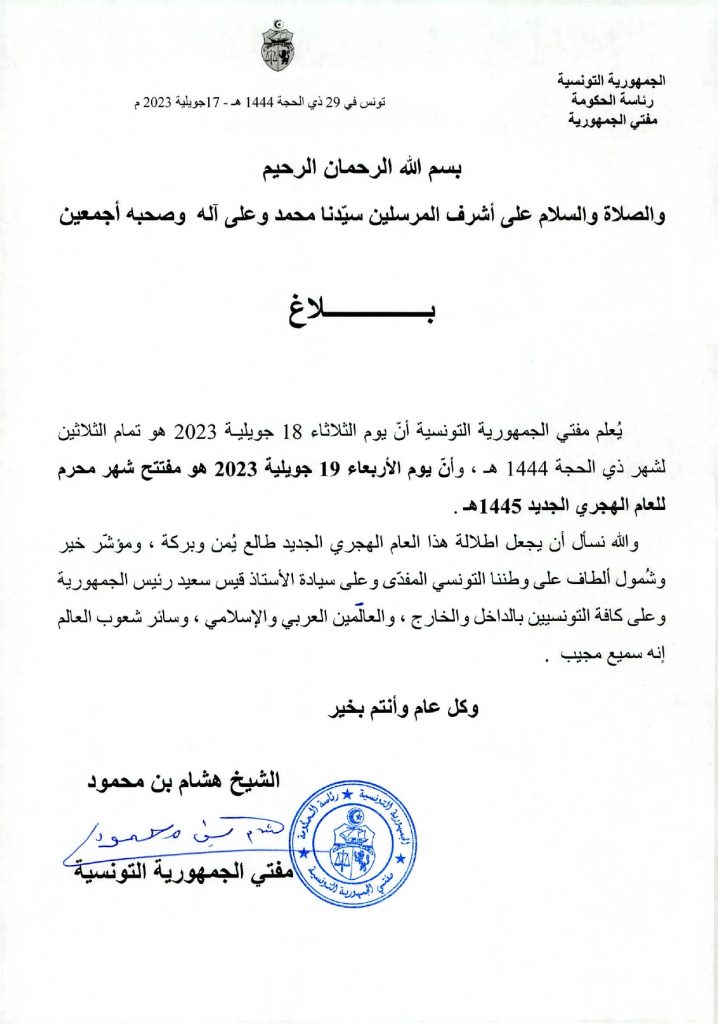 Le mufti de la république, Hichem Ben Mahmoud, annonce que demain mercredi 19 juillet 2023, marque l’avènement du mois de Moharem, de l’an 1445 de l’hégire.