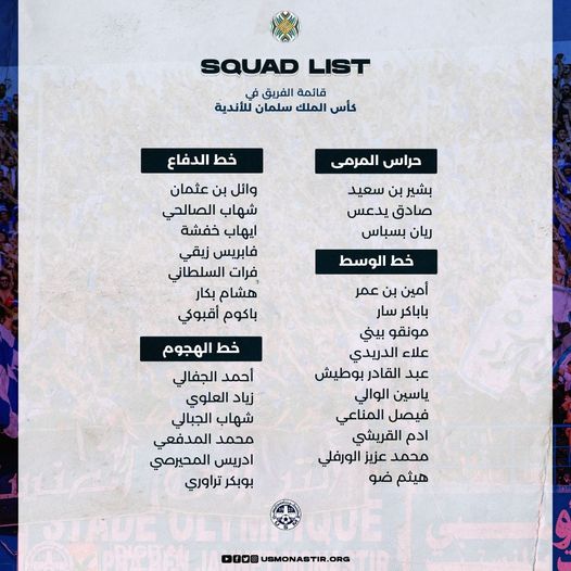 Pour disputer les 3 matches du 1er tour contre le Zamalek du Caire, Al-Nassr et Al-Shabab, ci-après la liste des 26 joueurs convoqués par le staff technique monastirien, qui feront le voyage vers l’Arabie Saoudite et représenter la Tunisie dans le groupe C de la coupe arabe des clubs champions 2023 :