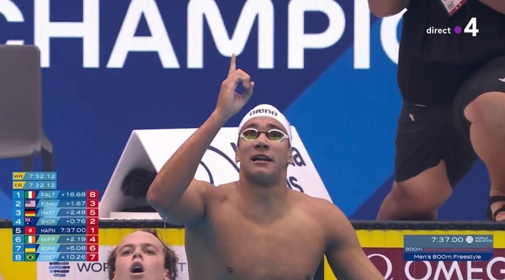 Hafnaoui est arrivé premier, en 7:37:00, devant l’Australien S. Short (champion du monde du 400m) et l’Américain B.Finke.