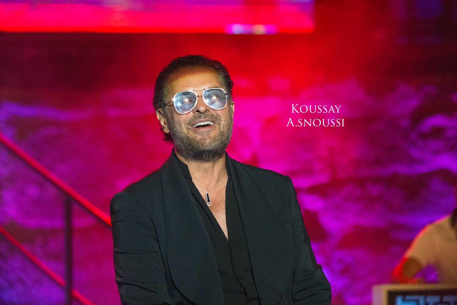 Son avatar et ses extraits de ses vidéoclips étaient diffusés tout au long de la soirée sur l’écran géant surplombant la scène. La superstar adulée a été accueilli comme il se doit avec des poussées de cris de joie et des applaudissements de spectateurs déjà conquis. Tout de noir vêtu, un large sourire qui ne le quittera pas tout au long de la soirée, il dévale les marches sous une pluie de confettis et après avoir entamé son premier titre « Ana Ismi Habibek » que le public reprenait avec lui, il s’est adressé à ses fans par ces mots : « Je vous aime. Vous m’avez manqué. Vous êtes merveilleux ». Dans les gradins, les torches des téléphones allumées contribuaient à la beauté du spectacle.