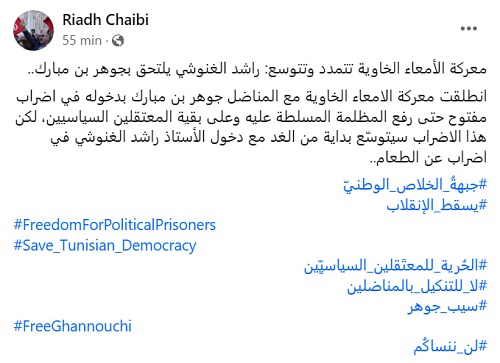 La grève de la faim du président d’Ennahdha intervient aussi « pour exiger la fin des poursuites contre les activistes politiques et la libération des détenus ».