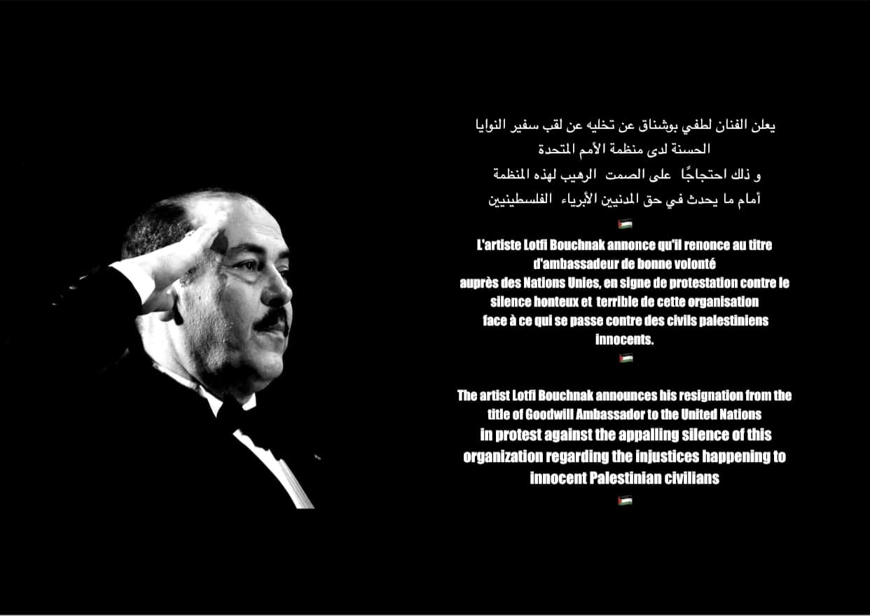 L’artiste Lotfi Bouchnak annonce qu’il renonce au titre d’ambassadeur de bonne volonté auprès des Nations Unies, en signe de protestation contre le silence honteux et terrible de cette organisation face à ce qui se passe contre des civils palestiniens innocents, a annoncé le grand artiste tunisien dans un post publié sur sa page officielle.