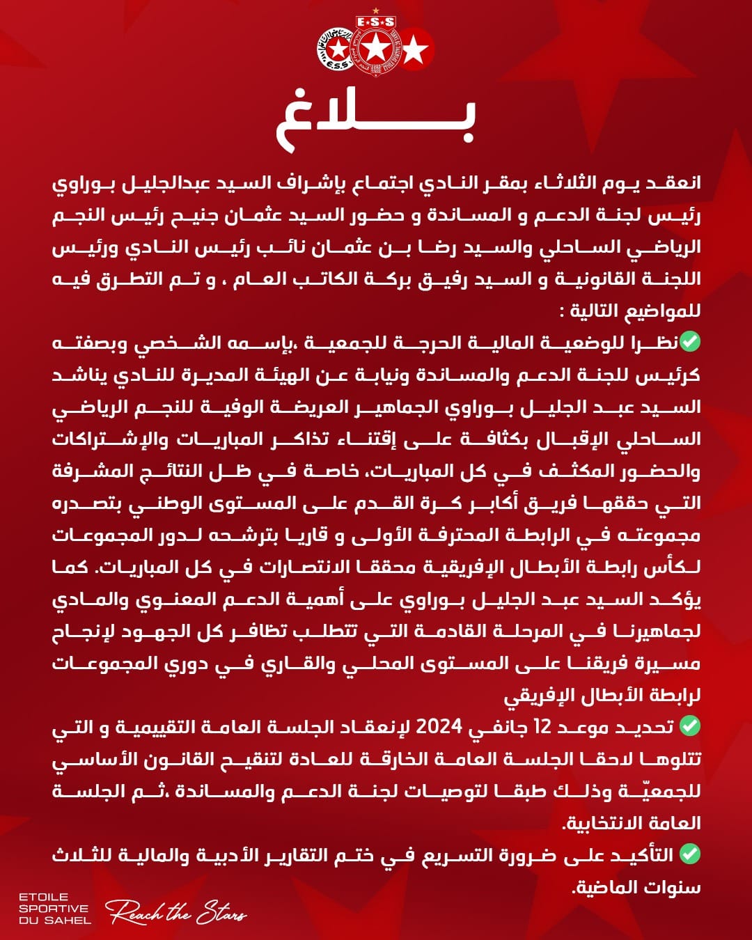 Cette assemblée sera suivie par une assemblée générale extraordinaire en vue d’amender les statuts de l’Etoile Sportive du Sahel avant l’organisation d’une assemblée générale élective un peu plus tard.
