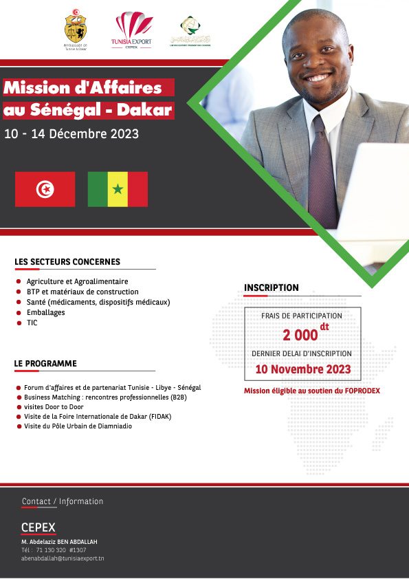 Au programme de ladite mission, des rencontres professionnelles B2B, une visite à la Foire internationale de Dakar (FIDAK) et au Pôle urbain de Diamniadio, ainsi que l’organisation du Forum d’affaires et de partenariat Tunisie- Libye- Sénégal.