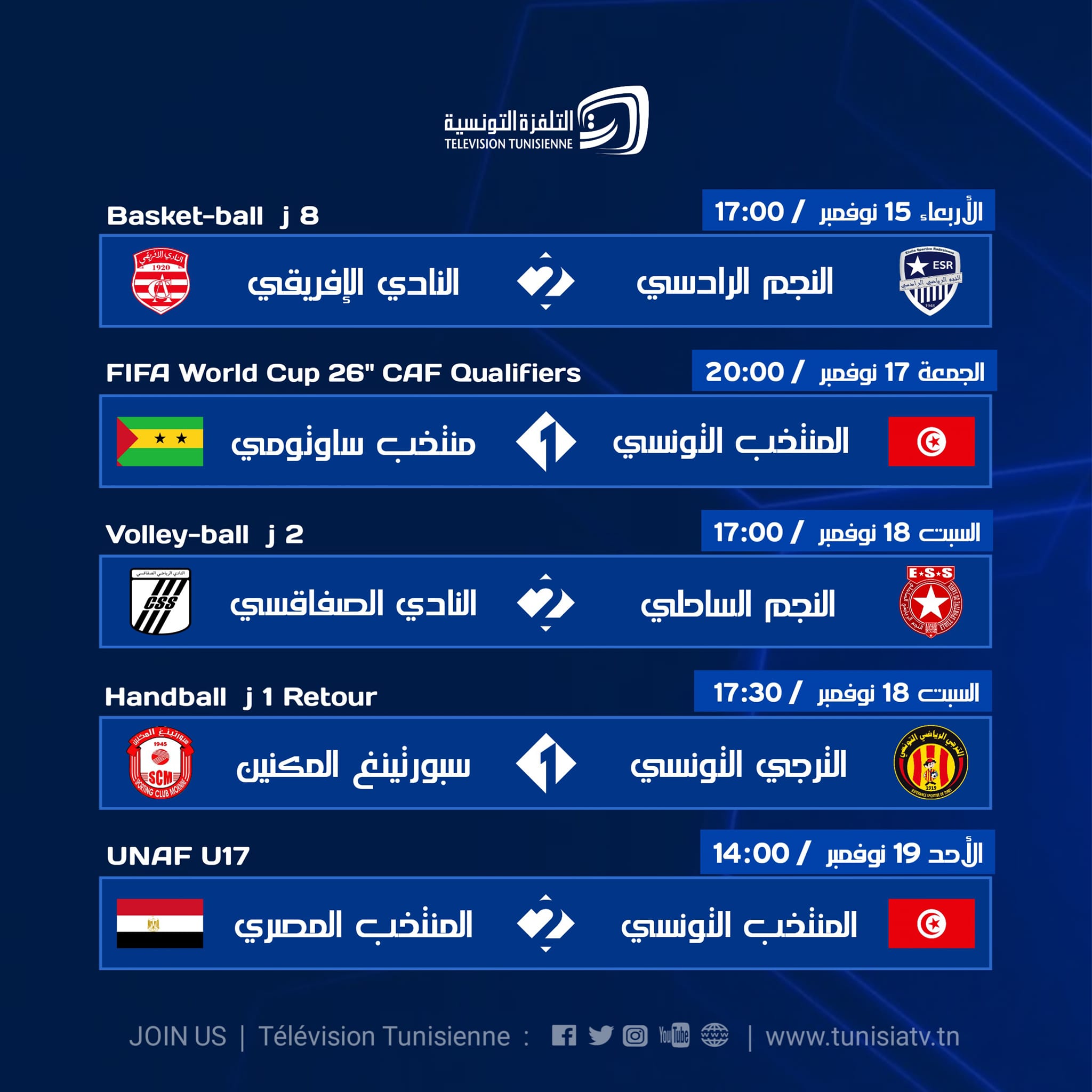 La télévision tunisienne a communiqué son programme TV pour les rencontres de la 11ème journée de Ligue 1.