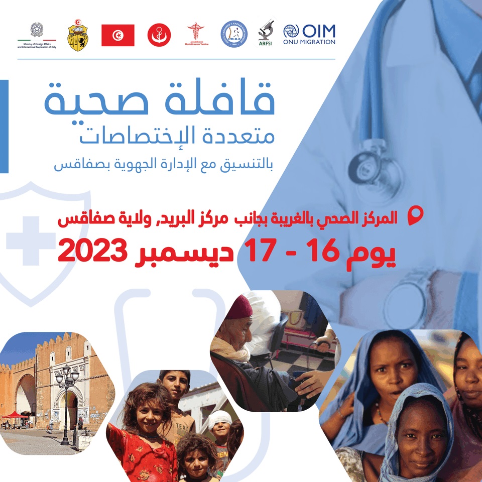 L’Organisation internationale pour les migrations (OIM) en Tunisie en étroite collaboration avec la délégation régional du gouvernorat de Sfax, le Ministère de la Santé Publique, la délégation du Croissant Rouge Tunisien de Sfax, l'Association Kassab pour la Recherche Scientifique et la Formation des Professionnels et l’Association des Physiothérapeutes Tunisiens organise une caravane sanitaire pluridisciplinaire destinée aux communautés locales de tout âge, origine, ou condition, y compris pour les populations tunisiennes, migrantes, réfugiées et demandeuses d'asile.