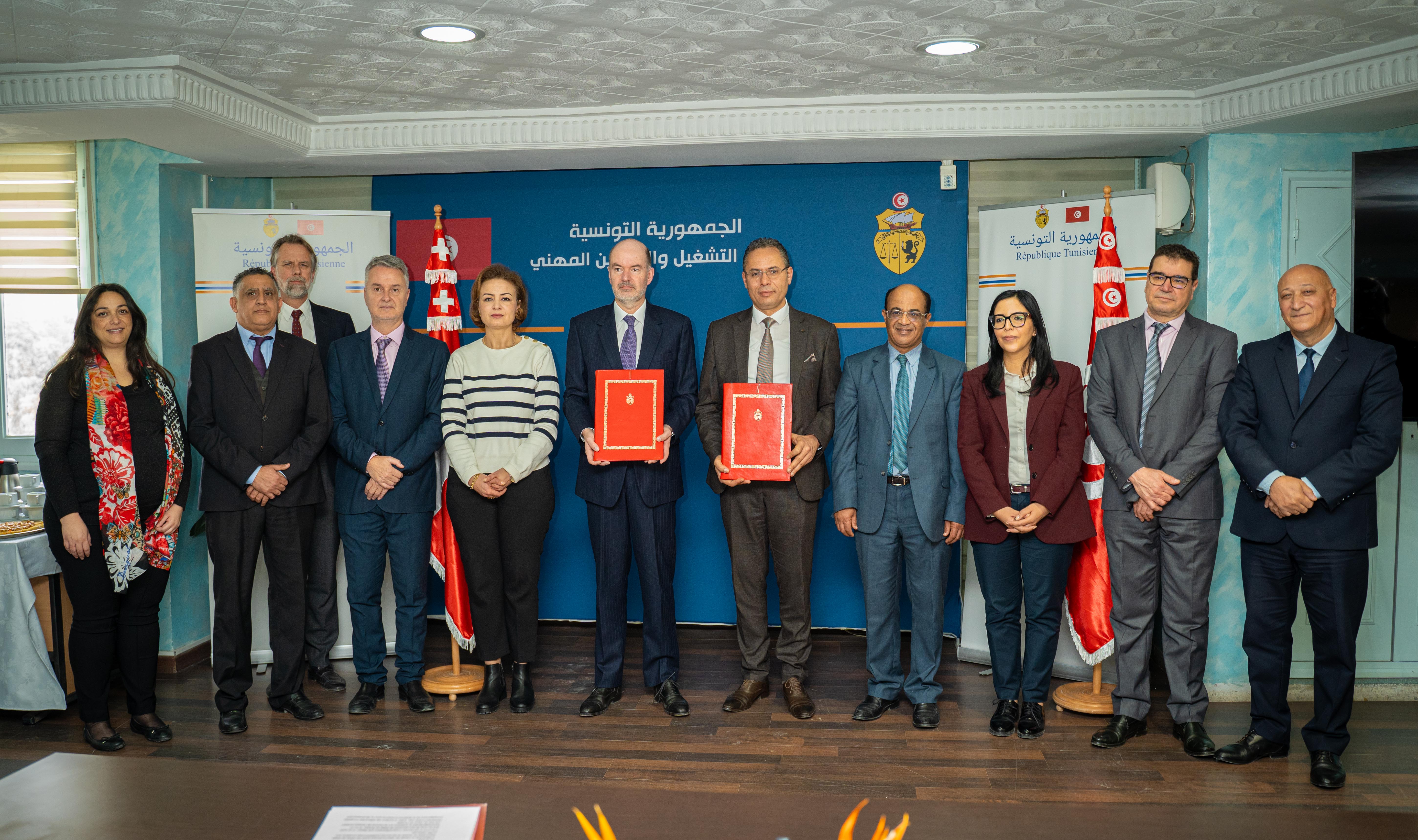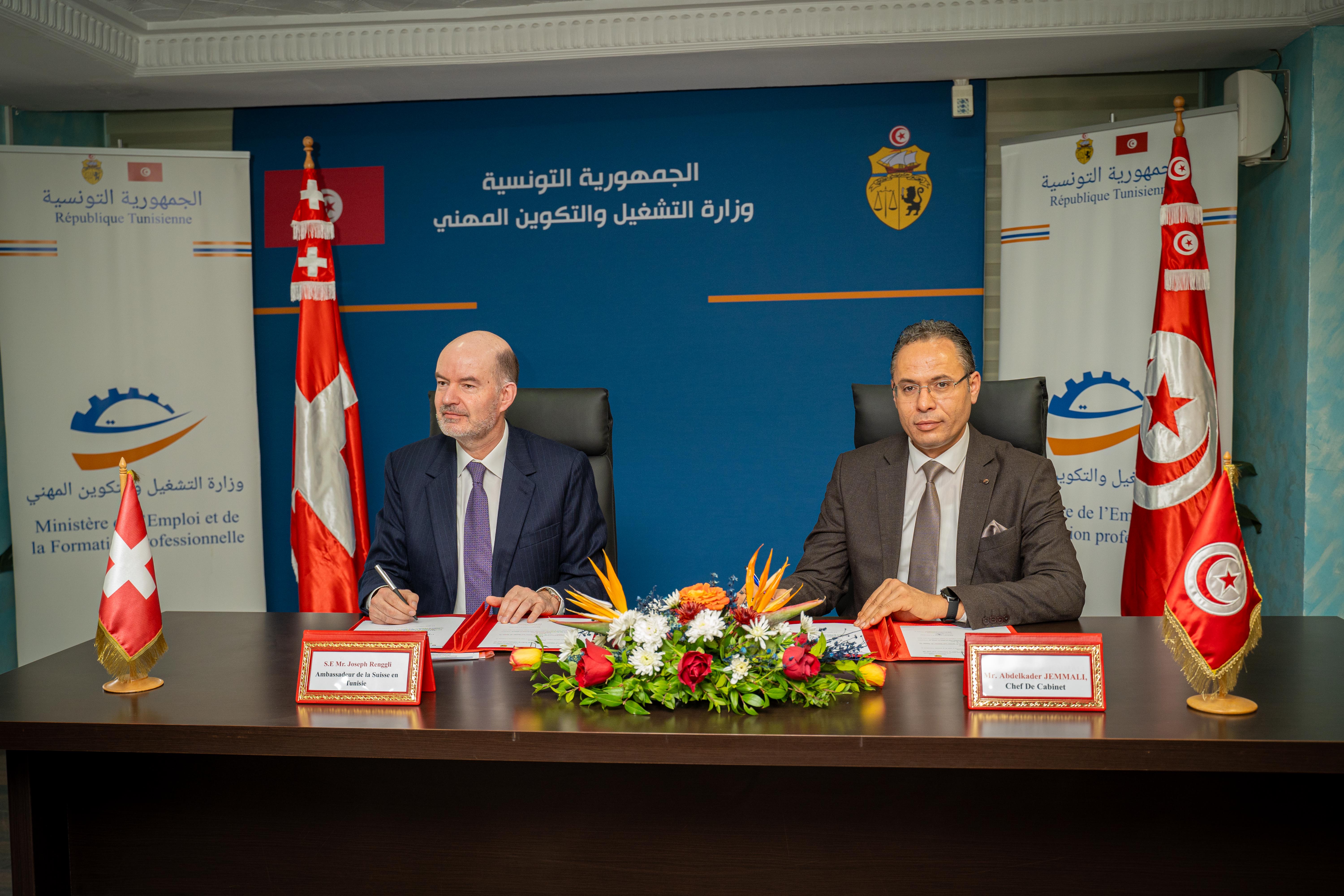 Le Chef du cabinet au ministère tunisien de l’Emploi et de la Formation professionnelle, M. Abdelkader Jemmali, et l'Ambassadeur de Suisse en Tunisie, M. Josef Renggli, ont signé vendredi dernier 19 janvier 2024 la convention du projet ''PERSPECTIVES pour les jeunes Tunisiens qualifiés et la contribution de la diaspora en Tunisie '', lors d’une céromonie qui a réuni des représentants d’acteurs institutionnels et des médias. Cette signature marque le lancement officiel du projet.