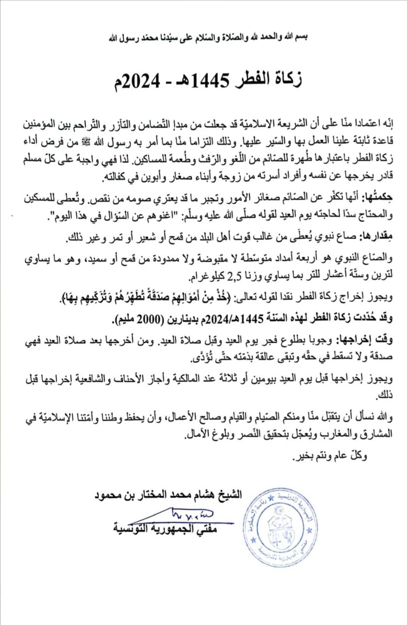 Le Mufti de la République, Hichem Ben Mahmoud, a annoncé, ce mercredi, que le montant de la Zakat al-Fitr pour cette année 1445 Hégire/2024 a été fixé à deux dinars.