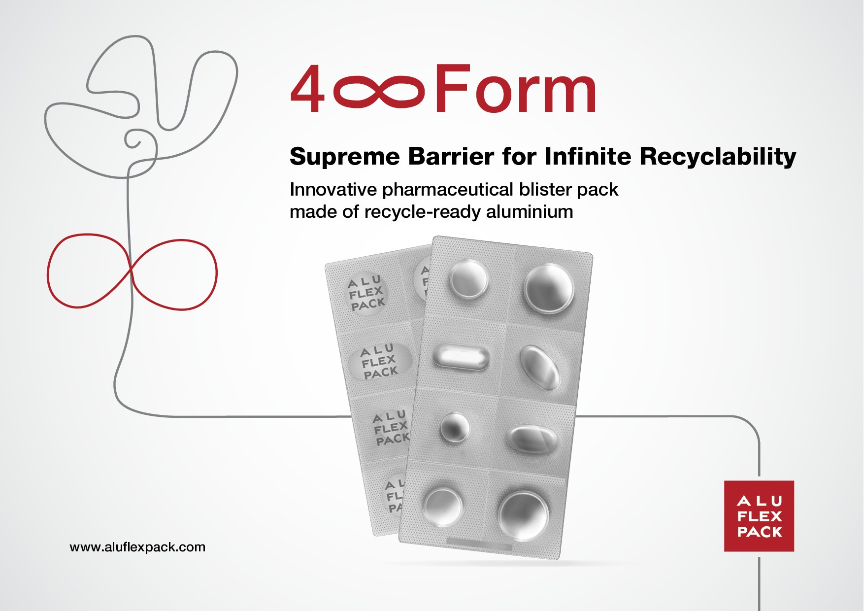 Le 4∞ Form est principalement destiné à l'industrie pharmaceutique, où il peut remplacer les solutions existantes utilisées pour l'emballage de comprimés, capsules et produits similaires, tels que l'OPA/AL/PVC (formage à froid) ou le PVC/PVDC (thermoformage). La différence importante est que l'emballage innovant d'Aluflexpack est entièrement fabriqué en aluminium laqué. C'est là que se cache le "secret" du nom du produit ; l'aluminium est un matériau qui peut être recyclé indéfiniment sans perdre ses propriétés, ce qui est extrêmement important dans l'industrie de l'emballage pour maintenir la sécurité et la qualité des produits.