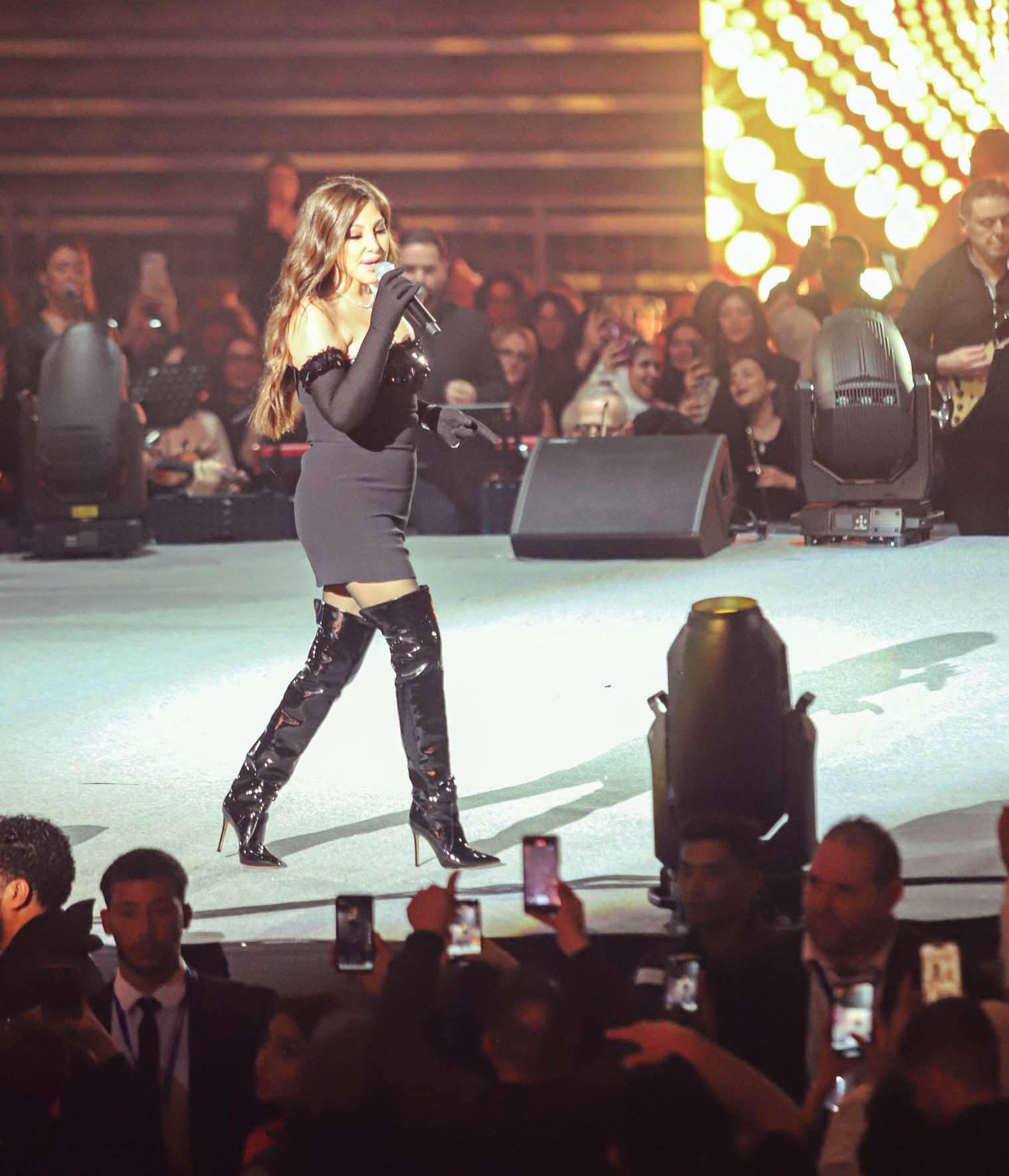 La star libanaise Elissa a fait sensation lors de son concert hier soir à la Salle de Radès en Tunisie avec une tenue noire audacieuse et élégante. Elle portait une robe courte moulante avec une coupe "strapless" ornée de paillettes scintillantes au niveau de la poitrine, ajoutant un mouvement fluide et une touche raffinée à un design sobre.
