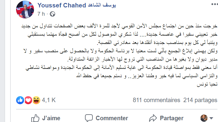 Youssef Chahed, le chef du gouvernement de gestion des affaires courantes a déclaré qu’il n’est concerné par aucun poste dans le gouvernement ni par aucune ambassade, après la fin de son bail à la Kasbah. Chahed a assuré dans un statut publié dans la soirée de mardi sur sa page Facebook qu'il continuera son activité politique sans penser aux postes de responsabilités.
