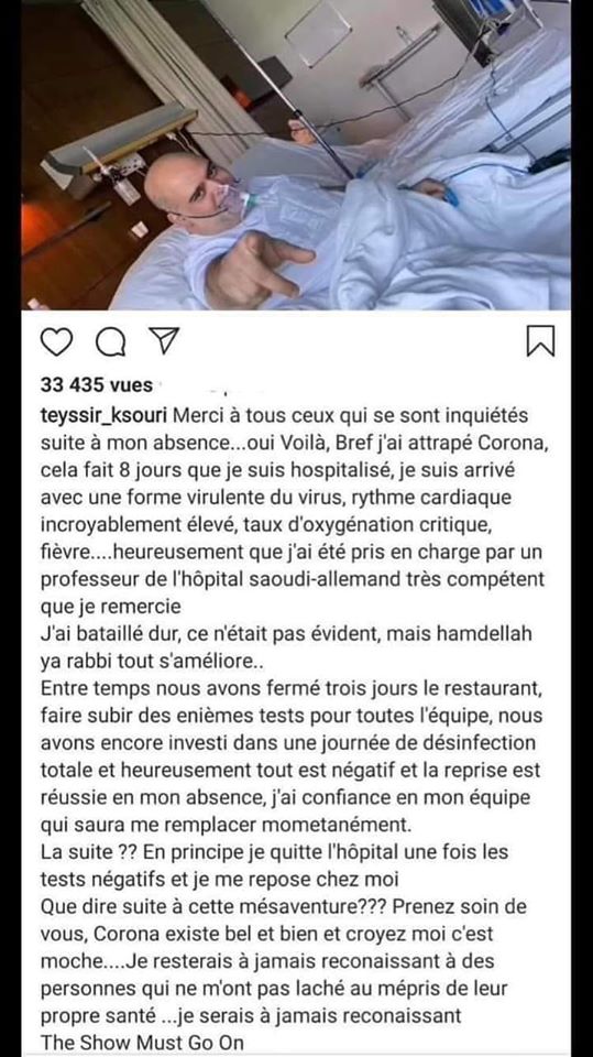Teyssir Ksouri a été hospitalisé à Dubai à l’hôpital germano-saoudien après avoir contracté le coronavirus.