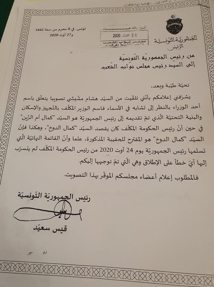 La présidence de la République a envoyé une correspondance au parlement l’informant d’avoir reçu la rectification quant au nom du ministre proposé à l’Equipement. Il s’agit de Kamel Edoukh et non de Kamel Om Ezzin.
