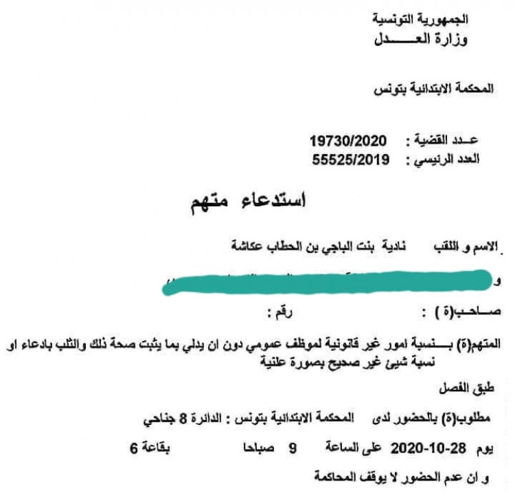 La cheffe de cabinet et conseillère juridique du président Saied, Nadia Akecha, serait convoqué par le tribunal de première instance de Tunis le 28 octobre 2020. Elle est accusée dans une affaire de diffamation.