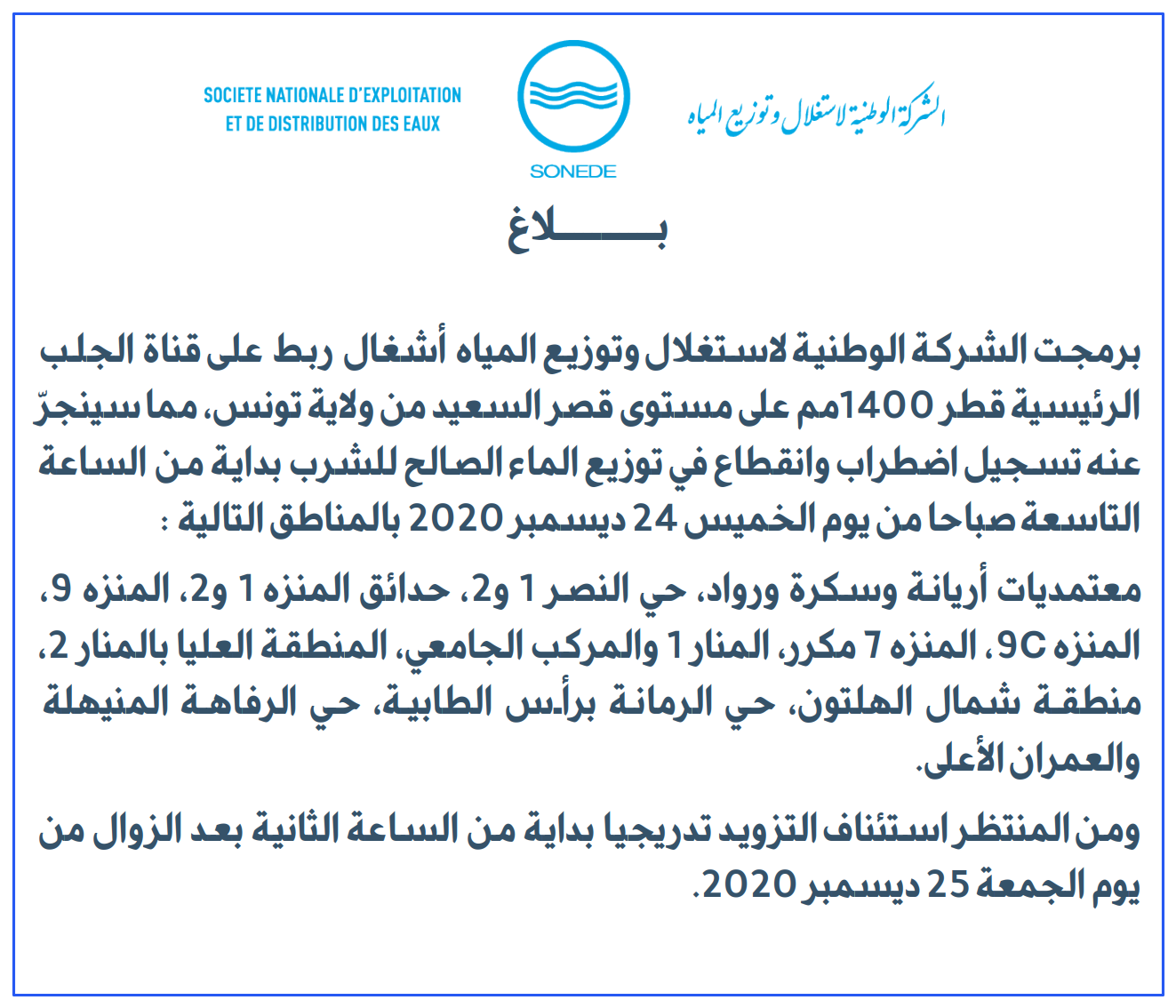 Une coupure et une perturbation de la distribution de l’eau potable seront enregistrées, à partir du 24 décembre 2020 à 9H, dans plusieurs délégations des gouvernorats de Tunis et de l’Ariana, a annoncé la Société Nationale de l’Exploitation et de la Distribution des Eaux (SONEDE).