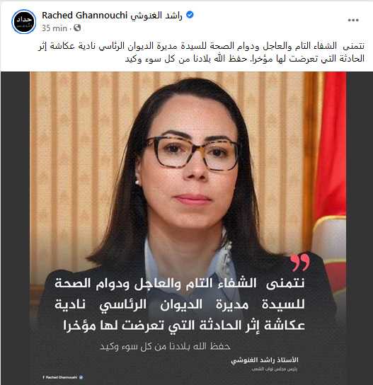 Le président de l’ARP et chef d’Ennahdha, Rached Ghannouchi, a adressé ce jeudi 28 janvier 2021, ses vœux de 'prompt rétablissement ' à la cheffe de cabinet du président de la République, Nadia Akacha.