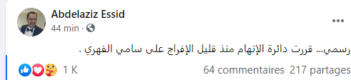 L’avocat Abdelaziz Essid a annoncé, dans un post publié hier mercredi17 février 2021, sur les réseaux sociaux, que la cour de cassation a décidé aujourd’hui de libérer son client Sami El Fehri, patron de la chaîne de télévision Elhiwar Ettounsi.