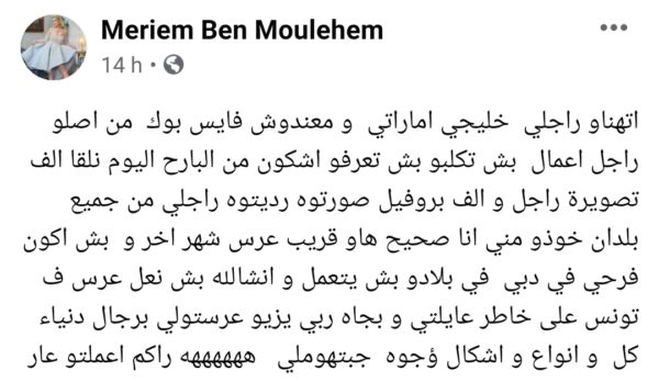 Sur son compte Facebook, Mariem Ben Moulehom a dévoilé que son fiancé est originaire des Emirats Arabes Unis.