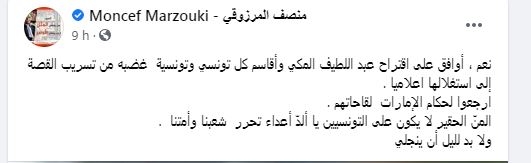L’ancien président de la République, Moncef Marzouki a exprimé son soutien à l’ancien ministre de la Santé et dirigeant au sein du mouvement Ennahdha, Abdellatif Mekki qui a appelé le chef du gouvernement dans un post publié sur sa page officielle Facebook hier jeudi 4 mars 2021.