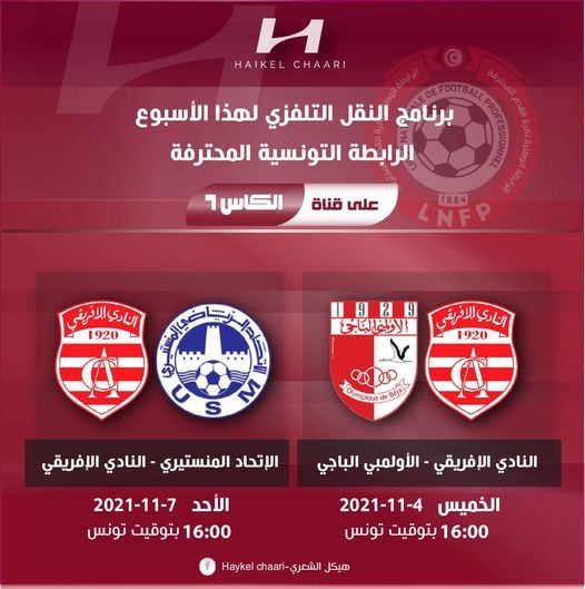 Le match du Club Africain et de l’Olympique de Béjà sera retransmis jeudi, et le match qui opposera l’Union Sportive Monasterinne et du Club Africain sera retransmis dimanche.