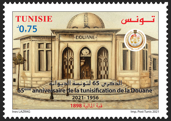 A l'occasion du 65ème anniversaire de la tunisification de la douane (1956- 2021), la Poste Tunisienne émet le 06 décembre 2021 un timbre-poste pour contribuer à mettre en valeur le grand rôle joué par la douane tunisienne en tant que partenaire actif à la stimulation du tissu économique, ainsi qu’au soutien du système de sécurité nationale, en adéquation avec les évolutions économiques et en protégeant les principes et valeurs de la société tunisienne. Ce timbre-poste ainsi que les autres produits philatéliques réalisés à cette occasion seront disponibles à la vente dans tous les bureaux de poste et via Internet à travers le site www.e-stamps.poste.tn à partir du lundi 06 décembre 2021.