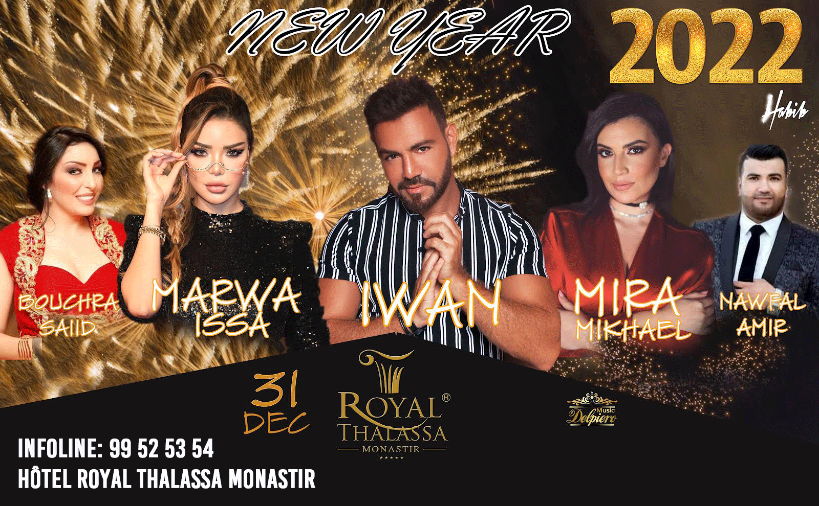 Cette soirée du réveillon 2022 sera animée par les vedettes Iwan, Marwa Issa, Mira Mikheal, Bouchra Saied, Nawfal Amir..