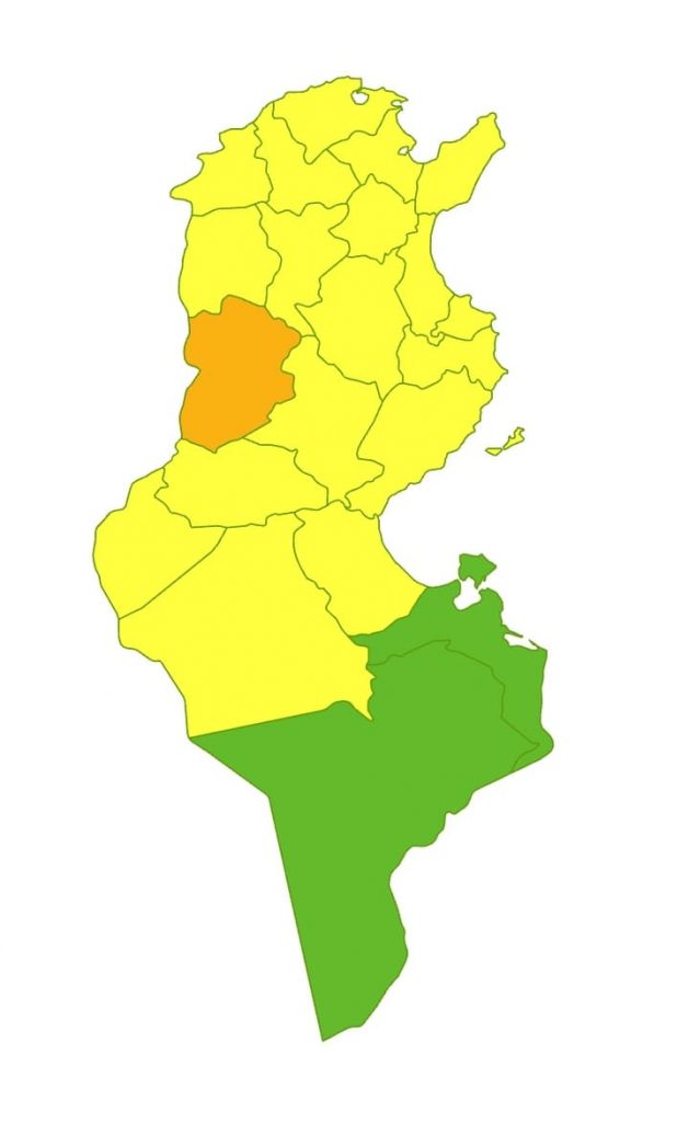 Alors que la couleur verte accordée aux gouvernorats de Médenine et Tataouine, signifie une situation météorologique normale.