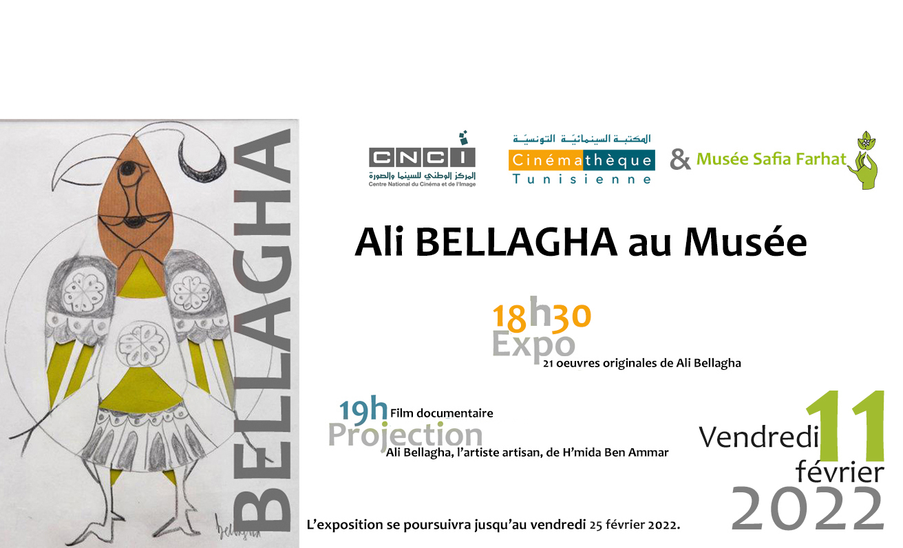 Au programme une projection/débat du film documentaire : « Ali Bellagha, l’artiste artisan », réalisé en 2004 par H’mida Ben Ammar, et une exposition d’œuvres originales de la collection familiale de l’artiste, qui s’attarde sur les différentes périodes mais aussi les nombreuses techniques utilisées. (Exposition qui se poursuivra jusqu’au Vendredi 25 février 2022)